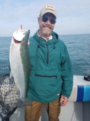 | My long running group from Wisconsin's that takes these same days each year were my guests this past week for most of the days and were handsomely rewarded with a fine four day catch with keepers ranging anywhere from 15 inches to big fish of the week being a crazy big fat 28 1/4” incher! And the amount of just under size Walleyes that we handled was just unreal. More on that subject in a moment. Wednesday we finished up with just shy of 20 keepers and Thursday, their final day we captured 26 Walleyes on a very rainy day but flat lake. They were definitely biting in the rain! Fridays group limited out as well quite easily and we were back at the dock by 11:00am. Not a real burn but a remarkable difference from the week before. The weekend was equally good with fish counts in the upper teens along with some really big Walleye. We even boated a huge Steelhead, the first of the season aboard “The Trophy” and lost his twin a short while later that was just a jumping fool. What a show he put on and when he finally won his freedom, I didn’t feel all that bad. Well played Mr. Steelhead, well played! |