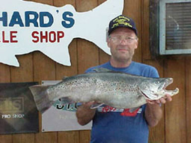 This Brown Trout was caught off the wall at the Walnut Creek Access July 4th at 6:30 PM. Fazle Buijubasic of Raspberry Street, Erie, Pa. was using a fathead minnow when the monster struck and fought him for 20 minutes on the 6# test line. He did not have a net with him and landed the fish with his hands. Measuring 32.25" with a 22" girth... it weighed in at 19# 10 oz. which shattered the existing State Record. Source: WCO John Bowser |