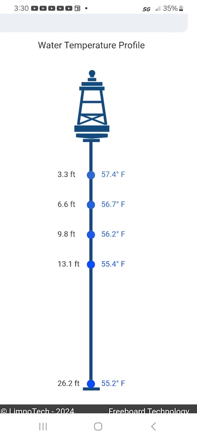 | A couple or so reports back I had mentioned that we had some very rough days but that after we returned nothing had changed with the water temperatures or the quality of fishing. I also explained how sometimes by late summer and early fall after a sustained big blow that there was always the possibility of the lake “flipping” or “rolling over” as some may call it. Well after the weekend blow of the 10th & 11th, we had a text book example of exactly what I was talking about. New this year we have a weather buoy just west of the Ashtabula Harbor opening that records and charts all kinds of weather data ranging from wind speeds to wave heights to all kinds of water temperature data. Checking the weather data page on Monday the 12th I could not believe my eyes! Now keep in mind that this buoy is only in about 30’ of water but still, we went from a 77 degree surface temperature to a 57 degree reading! The blow which was northeasterly for two hard days and nights had blown in some really cold water! Man, I didn’t even think there was anywhere in the lake even at depth where the water was still that cold! Just so I could believe my eyes later, here is a screenshot from my phone of what I was looking at on their Ashtabula water data page. |