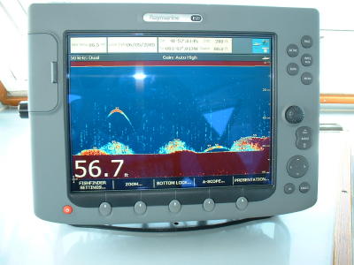 | The new Raymarine digital E Series High Definition fishfinder continues to show the Walleyes suspended in the now deeper water of the central basin along with tons of baitfish. What an awesome fishfinder this unit has proven to be. In 19 years of chartering, this unit has become the most precise, astonishing display that I have ever experienced. What a show! |