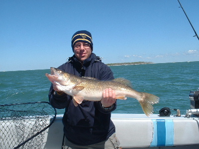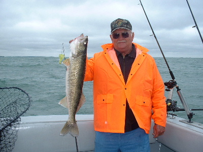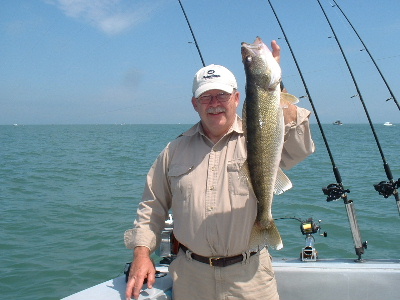 I continued to work the area between D can and Niagara reef, and we limited out every day with nice sized Walleyes. On Friday I elected to make the long run clear to Gull Island Shoal and Middle Island, all north of Kelleys Island and practically on the Canadian line. Wow! That's all I have to say about the grade of fish that we limited out with up there. Absolutely no small Walleyes. These fish were the Ashtabula caliber fish that have been eluding us in the shallower waters all spring. All post spawn females roaming around in the 30 ft. plus water. Our best program again was the #40 Jet Divers fished back behind the big planer boards anywhere from 60 to 120 ft. Nice, big solid hook ups. Very exciting! Hopefully this area will continue to produce these big fish but a lot of times these schools are really on the move. I truly believe these are the bigger Walleyes that are already migrating to the deeper, cooler waters of the central basin for the summer. Another week and that's where I will be. I hope I don't beat these fish back! |