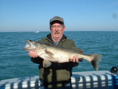 A very windy week! Last week was ushered in with a relentless northeast wind, which howled day and night for three days straight. Not even the big steel party boats dared to venture out. Finally by Thursday the winds eased and everyone got back out on the water. Fearing the worst, we headed out on what I thought was going to be a totally muddy mess. Surprisingly the water was stained but not really that bad! The real surprise was that once again it didn't even slow the Walleye fishing one little bit. Everyone picked up where we had left off. The Walleye bite is still as hot as it was before the blow. The only thing I noticed was that the best action was slightly off the reefs in 15 to 16 foot of water. We stilled jigged a couple of days but we also trolled one day. Although the trolling bite is still slower then the jigging action right now, the fish are bigger. We managed to get a few post spawn females including one 29 1/2 trophy which hit a Fenwick Wobbling Minnow fished 40 foot back on a #20 Jet Diver off the planer boards. |