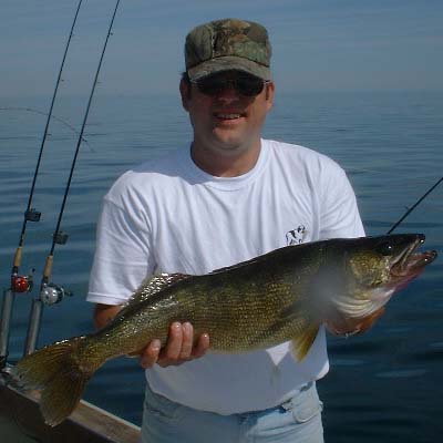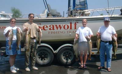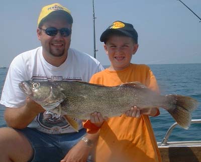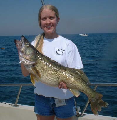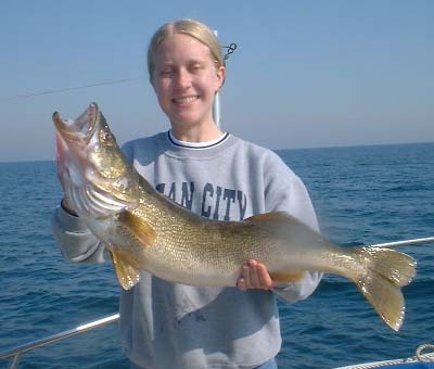 The fish pulled side to side and up and down. Then this 12.25 pound 30.5 inch monster showed its colors. Walleye!!! and what a walleye it was. Hitting a watermelon harness was its down fall with Lori on the other end of the line. The slow forward drift/troll allows for some real walleye fighting. Don't let anybody tell you a walleye don't fight.