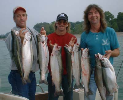 The steelhead and salmon action is well underway. Each passing cold front brings more fish to the near shore and streams. Action on Sunday the 29th of September was fantastic. The nine fish pictured were only a small amount of the many hooked. The steelies are full of fight, reels sing and the fish jump in search of freedom trying to spit the hook. Black and red shallow running lures do the trick trolled in front of the many streams. Walnut Creek and Trout Run have been the recent hot spots. Fished 5 to 10 feet depth all day. The trench has also been hot for the steelie. |