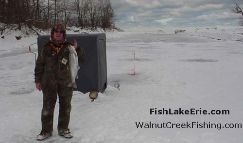 Friday the 16th fines few anglers at Walnut Creek this day. Dave had caught a nice steelhead thru the ice. The weather has been cold, ice continues to build. Few fish were caught this day. Yesterday was much better for catching steelies. The lake has ice for a mile or so but is very thin and is mostly made up of frozen pieces. A person was reported to fall through yesterday near shore in shallow water.