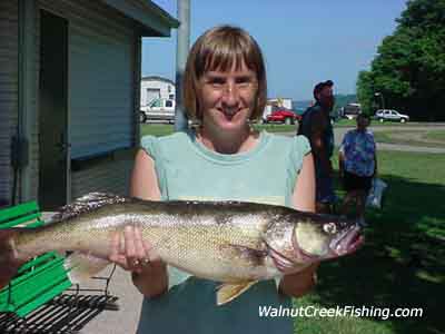 | Julie Powell of Slippery Rock caught her 9 pound 5 ½ ounce Walleye in 77 ft of water, Northwest of Walnut, in the middle of the first trench. He came in off the downrigger with a rainbow (gold back) spoon.