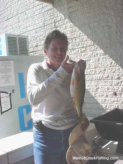 | PERCH: Here is a nice 1 pound 11 ounce, 15 inch perch. Birgitta Allgeier of Union City, PA caught it straight out of Walnut Creek in 60 ft of water. STEELHEAD There are a couple being caught in the creek but they haven't had their run yet. I figure it will be in about two weeks with the weather the way it is. The water temp is still 72 degrees. When it is 65-68 then you can start looking for the run. Also, we need some cold rain. |
