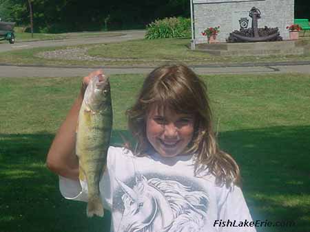 PERCH: Nine year old Jennifer Ochs of Lucinda, PA brought in this 1 pound 1/2 ounce Perch. It was 13 1/4 inches long. She caught it with her family out in 50 ft of water straight out of Walnut Creek. Not too many people coming in with Perch that I have talked to. I know they are slow in getting schooled up. |
