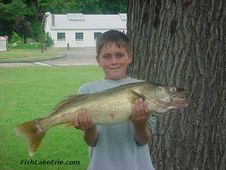 | Eleven year old Chris Catrabone of Harborcreek, PA came in with this 10 pound Walleye. The boat he was on limited on Walleye. They were out in 40 ft of water about 4 miles west of Walnut Creek.. |