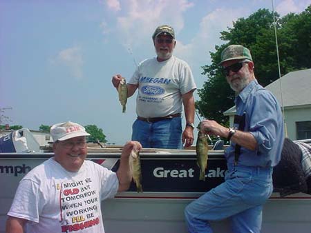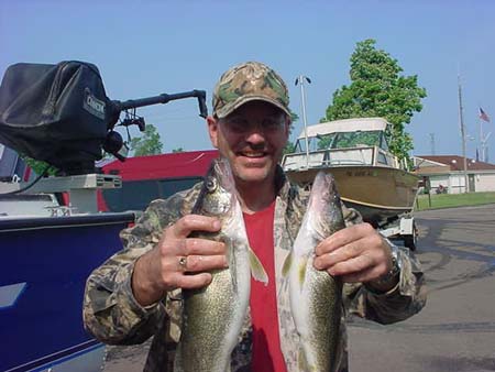 | WALLEYE: Bob Rottet was up with Kelly Sharp (Manager of Walnut Creek) from Harrisburg and wanted to go out fishing. He went out with Bill Caughey(Another Addiction) and they came in with their limit of Walleye at 9:30 AM. They were out in around 38 ft of water between Trout and Godfrey. They used harnesses to catch them. Most everyone was getting their limit or close to it. The Walleye seem to be just about everywhere, in close that is. I have had a couple people go out to the trenchs and not get very many, so mainly they are in close still in just aobut 35 to 40 ft of water trolling or drifting east to west from Walnut to Godfrey. The color seems to be purple/black or Humans are not the only fishing entities around. Jill, Doc Weticks dog, jumped off his boat and went fishing. He got lost and Don Clayton (Fish Connection) found him and brought him in. Jill had a Small Mouth Bass fish in her mouth. WEATHER: The weather for this weekend doesn't seem to be no good. Saturday they are calling for 1-3 ft waves in the morning but then a chance of showers or thunderstorms in the afternoon. That will kick up the waves and they are supposed to be 4-6 ft on Saturday night and Sunday. THE BRIDGE ON WALNUT AND DUTCH ROAD IS NOW OPEN |