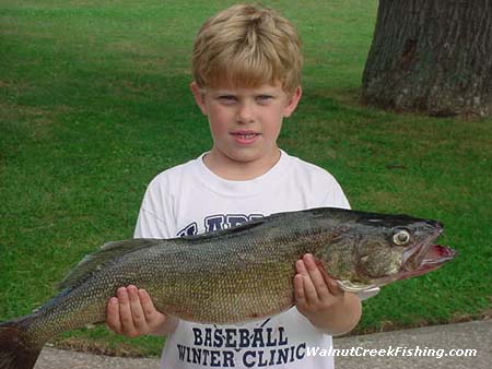 | WALLEYE: Seven year old Sawyer Reed came in with this nice 6 pound 9.5 ounce Walleye. He caught it in 72 ft of water straight out of Walnut Creek on worm harness. His color was purple. |