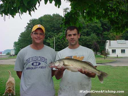 | Eric Wells of Pleasant Hills and Bryan Glasspool of Bethel Park are here showing this 8 pound 6 ounce Walleye Bryan caught on the “SeaWolf” charters. He caught it northeast of Walnut Creek in less than 40 ft. of water on worm harness. His color was white and pink. |