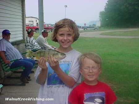 | Ten year old Maria King and 5 year old Tanner Sliker came in to get this fish weighed for Angler Award. Maria caught it in 52 ft of water northwest of Walnut Creek. It weighed in at 1 pound 1/2 ounce and was 12 1/2 inches long. Maria named it Bill. |