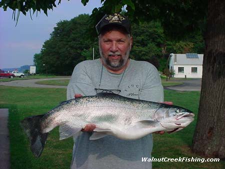 | STEELHEAD: Alan Laskosky also brought in this 11 pound 6 ounces Steelhead. It was 30 inches long and had a girth of 18 ˝ inches. He caught it in 70 ft of water straight out of Walnut on a worm harness. He said the colors were multi-colored. |