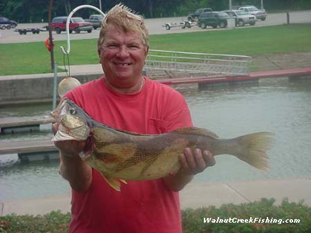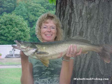 | WALLEYE: John Brogley brought this 11 pound ½ ounce Walleye in for weighing. It was 30 ½ inches long and had a 18 ¾ inch girth. He bled it so it probably went close to 12 pounds in all actuality. He was on the boat “Sandy Dee”. They were out in 61 ft of water straight out of Walnut Creek. His color was Pink Lady. |
