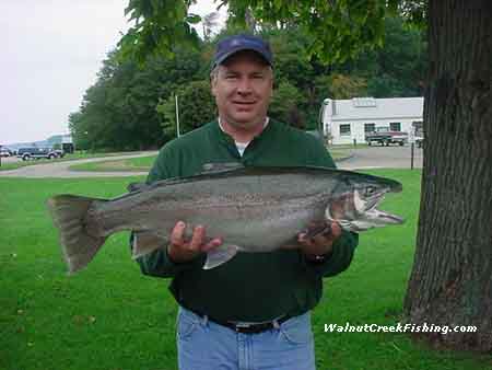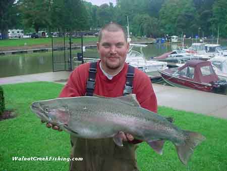 | STEELHEAD: Mike Sprowls from Washington, PA caught this beautiful 15 pound 2 ounce male Steelhead at Trout Run. It was 33 inches long and had a girth of 20 ½ inches. He used Green power bait. |