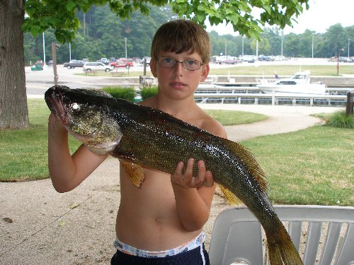 WALLEYE: Twelve year old Tyler Brown of Utica, PA brought in this 7 pound Walleye. He was fishing on the boat “Corky”. They were out in 60 ft of water East of Walnut Creek. He caught his on a night crawler and Blueberry Muffin. The same for Walleye as for the Perch. When they are on, they are catching like crazy. But when they shut down no one can catch them. Some boats are getting them in close and some are going out to the first trench and getting them. |