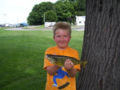 PERCH: Nine year old Brent Sutula of Erie came in to get an Angler Award for his 1 pound 3 ounce Perch. It was 13 inches long and had a girth of 10 inches. He caught it in 53 ft of water North of Presque Isle off the Point on a minnow. I only have the one picture this week. Not too many good days. The Perch seem to be the only fish anybody is having luck with. And then you have to get the White Perch with the Yellow Perch. From what I hear for every Yellow Perch there is at least one White Perch. But they are getting them in 52-53 ft of water straight out of Walnut Creek. As for the Walleye, they must have found a good hiding place with all the storms we have had this week. No one is having luck finding them. I hear you might find some out East but out this way on the west side of town they are being very evasive. |
