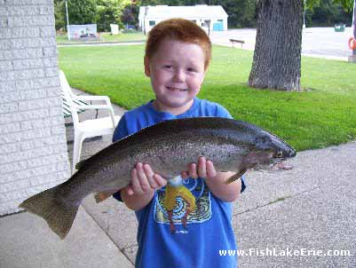| STEELHEAD: Eight year old Paul E. Martin of West Mifflin brought in his first Steelhead. It was a female and she weighed 5 pounds 1 ounce. She was 23 inches long and had a girth of 13 ¼ inches. He caught her in the Chutes in Walnut Creek on a single egg. |