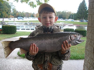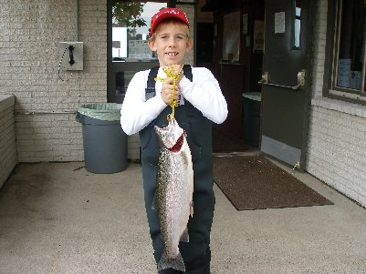 | Fifteen year old Jeremy Cummins of Claysville, PA brought in this 7 pound 9 ½ ounce Steelhead. It was 26 ½ inches long and had a girth of 16 inches. He caught it trolling in front of Walnut Creek on a Blueberry Muffin stinger. |