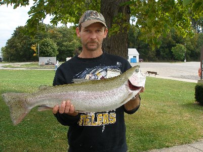 | Scott Dowlan of Shippenville, PA casting into the Lake at Walnut Creek caught this nice 9 pound 5 ½ ounce Steel head. It was 28 ¼ inches long and had a girth of 17 ¼ inches. He caught it on Power Bait and the color was green. |