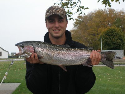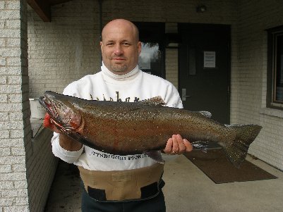 Brad Dickey of Mechanicsburg, PA caught his first Steelhead. He received and Angler Award for First Fish. It was 8 pounds 1 ounce, was 28 inches long and had a girth of 15 ¼ inches. He caught it on a hair jig in Walnut Creek. |