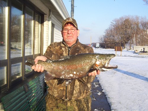 Gary Gilliland of Chicora, PA brought in this nice looking male Steelhead. He was 11 pounds – 9 ½ ounces and was 29 inches long with a 19 ¼ inch girth. Gary caught him at the “stop sign hole” on a “shrimp fly” he tied. |