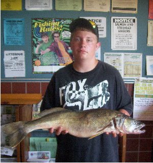 | Fifteen year old Brett Benson of Hollidaysburg, PA brought his Walleye in for Junior Award. It was 7 pounds, 8 ½ ounces,, 29 inches long and had a girth of 16 ½ inches. He was out with Lucas (above) in 59 ft of water straight out of Walnut. His color harness was Blue. |