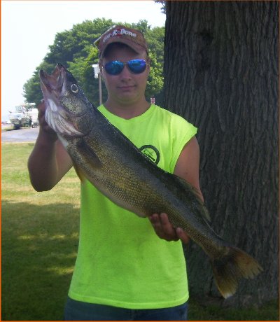 | Sixteen year old Steven Pritts brought in his 9 pound 5 ½ ounce Walleye. It was 29 ½ inches long and had a girth of 16 ¾ inches. He was in the 60 ft of water off Trout Run also when he caught his. His was on a Green Emily harness. |