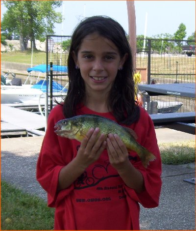 | PERCH: Eight year old Mackendra Fedei of Fairview, PA brought in a 13 ounce Perch for Angler Award. It was 12 inches long and had a girth of 8 ½ inches. She was out in 52 ft of water off Walnut Creek on Emerald shiners. |