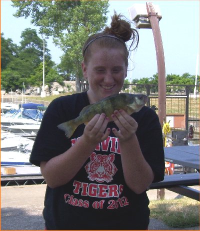 | Mackendra’s cousin fourteen year old Courtney Fedei of Fairview, Pa brought in a 12 ounce Perch. It was 11 ¾ inches long and 8 ¼ inches in girth. She was out in the same 52 ft of water off Walnut Creek. She also was using Emerald shiners. The Perch are still out in the 50 ft of water range straight out of here and off Trout Run. I was told by most people to find the Perch pack and go either West or East about ½ mile or so. They seem to do better away from the pack. WEATHER: This coming weekend the weather is supposed to be: Friday – SE winds / 10 knots becoming South 5 -15 knots / waves 2 ft or less. High of 83 degrees. Saturday – S winds becoming SW / 5 – 15 knots /1-3 ft waves. 30% chance of thunderstorms. High of 82 degrees. Sunday – SW winds / 5-15 knots / 2 ft or less. 40 % chance of thunderstorms. High of 85 degrees. Now don’t forget they update the forecast four times a day so this is a tentative forecast. |