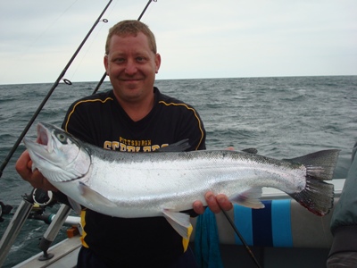 The best one that we were able to bring to the boat this past week was a 32 inch beauty that was just a hair shy of 11 lbs ! We've also started capturing some Steelhead which is always fun as I search further and further offshore looking for the "Mother Load". I sure haven't had much help out there. Nobody seems interested in fishing when things are tougher. I guess everybody else just wants to be a hero and start when things become suicidal. I wish I had that luxury. I have to go everyday. That's my job.