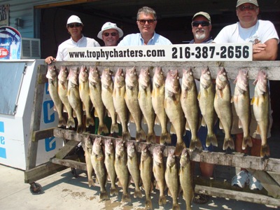 A couple of great days and a couple of much slower days.   Boy, if you could see my production so far this summer on a graph, it would look something like this: VVVVV  Lot's of peaks and valley's !  We finally had a couple of really super good days out of Ashtabula.  But for each good day that I had, we've also had a slower day or so.  So far the size of the fish, regardless of how many we catch for the most part has been simply spectacular !  Saturday just for fun of it we weighed our top 6 Walleyes from our limit catch and it came up a whopping 57 pounds !  This first picture here in this report is of Saturday's catch and it's not hard to spot the top 6 fish that I am talking about...