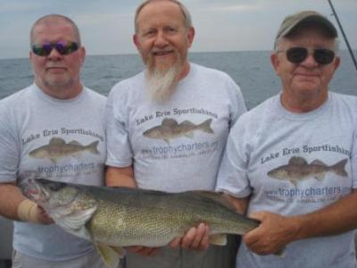 And several other days were marginable last week where we fished under less then ideal conditions but the Walleye didn’t seem to mind it.  The great fishing that has been taking place the last few weeks is still continuing for us with spectacular limit catches of huge Walleyes !  It was just more challenging with the choppy seas and threatening thunder storms bearing down on us a couple of the days.  We just worked that much harder and faster aboard “The Trophy” to get the job done and boy did we ever.  I am blessed this time of year with the heart of my schedule and my longest running guests coming back now for their yearly fishing outing.  Many groups are guys that I have had for well over twenty years now.  There isn’t too much training or coaching that I have to do.  We just go to work and “get er done”  Most just want to know “how far back ?” and jump on it.  Guy’s are running wire lines out... others are setting the boards out while someone is watching and setting the Dipsys to whatever count I tell them and we’re off to the races.  I have everyone help watch for boats.  We work well together everyday as a team.  It’s really not all that tough when they are “biting” !  lol