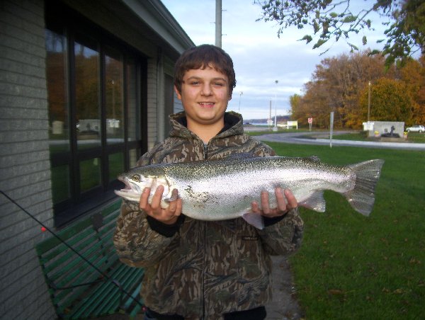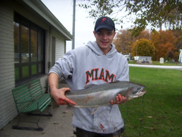 Thirteen year old Shane Wallace of Erie Pa caught his 8 pound 13 ½ inch female Steelhead at the Stop Sign hole on Walnut. It was 27 inches long and had a girth of 17 ¾ inches. He caught her on Pink egg sack.